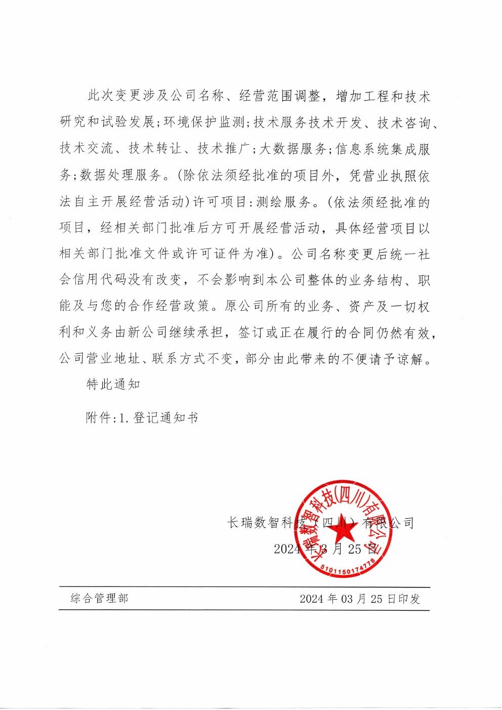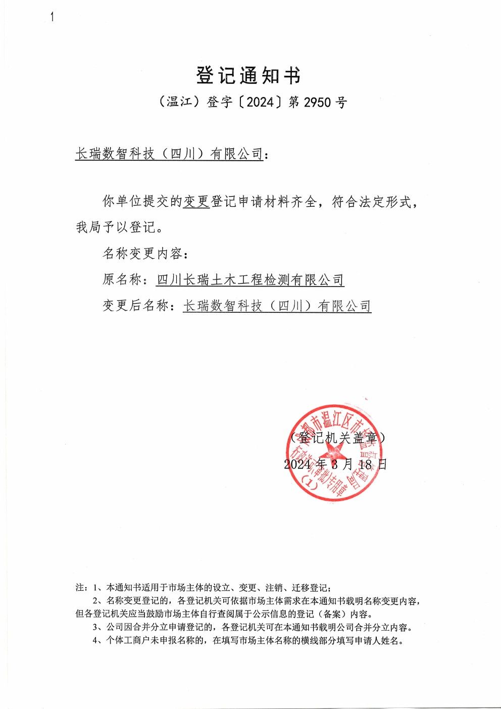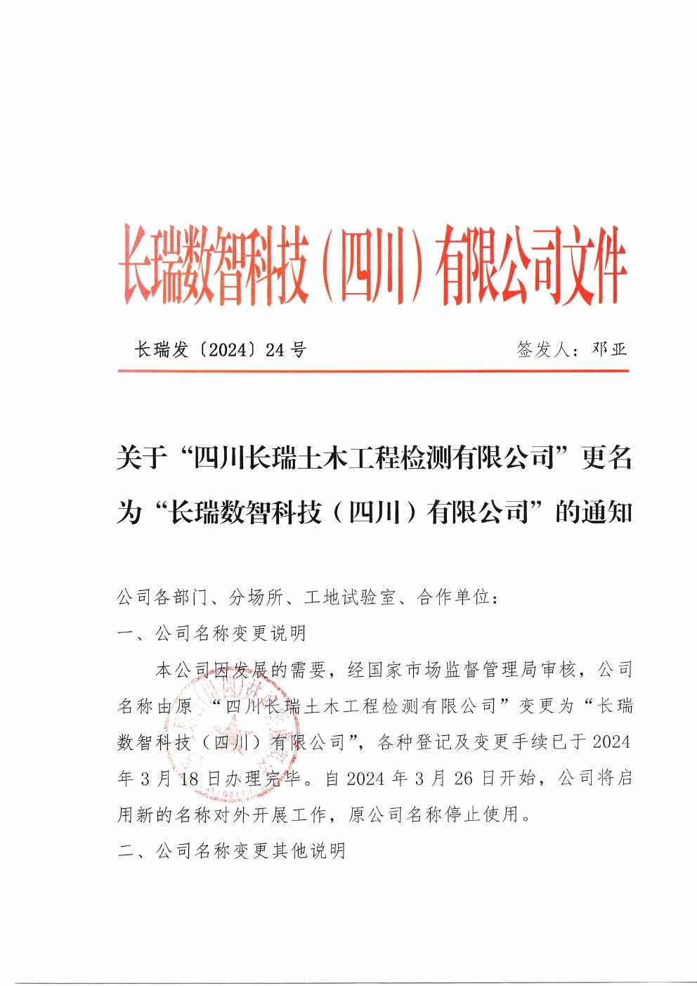 關于“四川長瑞土木工程檢測有限公司”更名為“長瑞數(shù)智科技(四川)有限公司”的通知